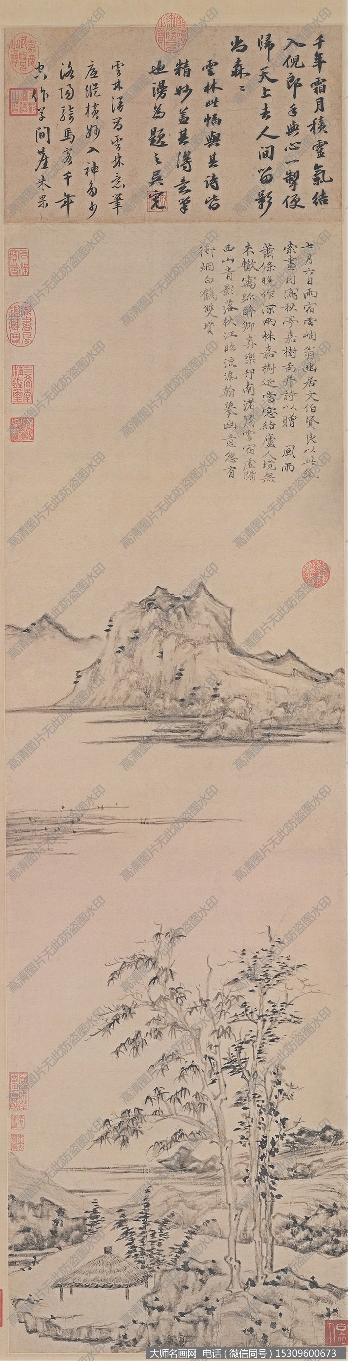 元 倪瓒《秋亭嘉树图》超高清作品百度云网盘下载,4134x16142像素,JPG格式和TIF格式各1张,共2张,共306M。